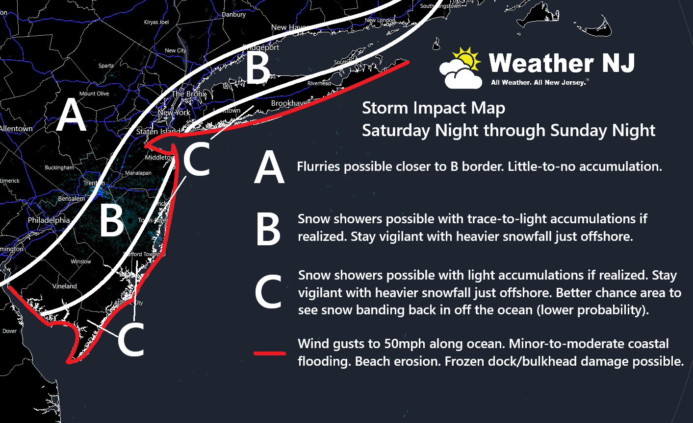 In English: The most reasonable expectation for Saturday night through most of Sunday are anything from a graze of snow showers to nothing at all. Given how intense the storm will be out in the ocean, there are certainly concerns for changes over the next few days and even surprises through the 11th hour. Although there is no numerical computer data guidance to suggest such, I recommend staying vigilant should SENJ, especially the SENJ coast, get into some harder snow. Otherwise, the above graphic illustrates a very middle of the road, gray, approach in a black and white situation (harder hit vs miss). I could see winds gusting to 50mph along the immediate beach coast and maybe 30-40mph away from the ocean phasing out to even less the further W and N you get away from the ocean in NJ. Minor-to-moderate coastal flooding is likely, especially during the ~8am Sunday high tide and ~8pm evening high tides. Add the element of frozen bay tops and you’re looking at marine dock/bulkheading damage. If water comes into the streets and then retreats, some of that will likely freeze before evaporating. Some unique coastal cold hazards coming into play. I will likely do another video tonight focused mainly on marine impacts but also any developments on evening model guidance.
