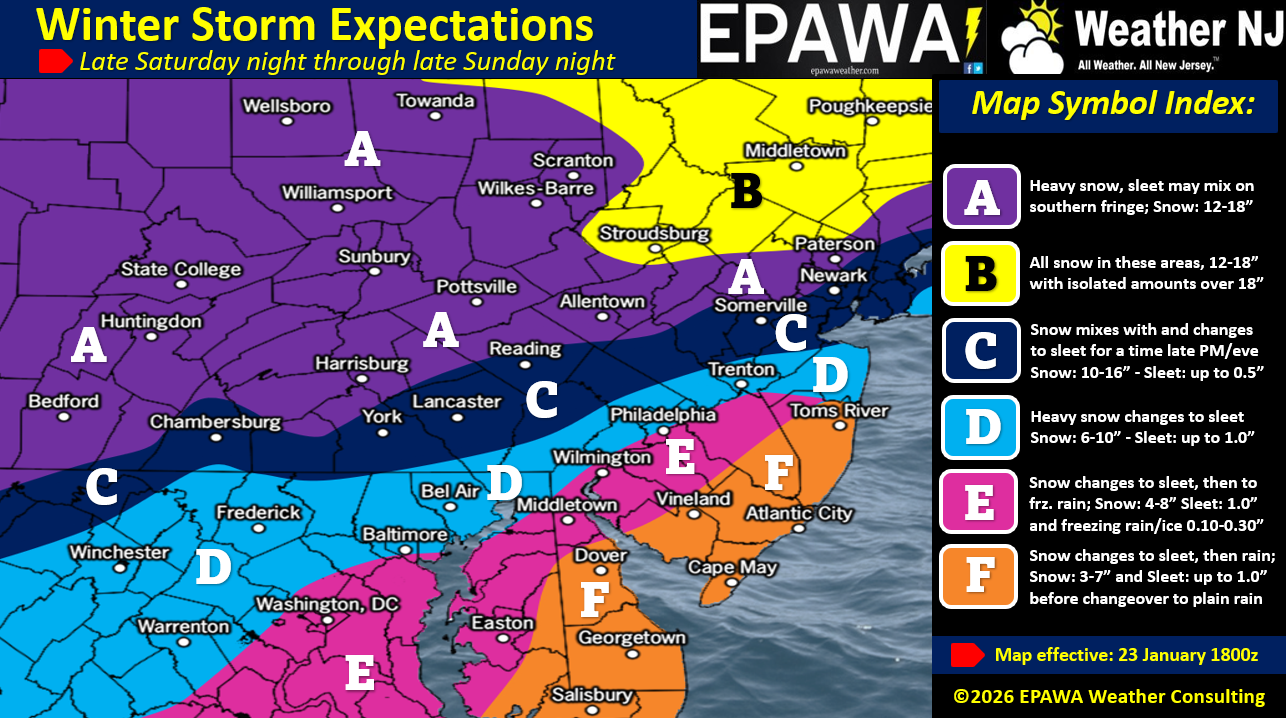 In English: It will turn much colder tonight into tomorrow but tomorrow looks dry. Light snow then moves in around midnight or slightly after (Sunday morning) and increases to moderate then heavy statewide until about noon on Sunday (phase 1 of storm). Precip then begins mixing SE to NW across SENJ, ultimately turning all areas along and SE of I-95/NJTP over to at least sleet and possibly freezing rain/plain rain further S (phase 2 of storm). NW extend of sleet highly uncertain but looking between I-95 or maybe 20-30 miles NW of. A KABOOM is still looking good for NNJ (N of I-78, possibly N of I-195). S of I-195 and SE of I-95 not so much. Mixing then changes back to snow and precipitation ends no later than noon-ish Monday but possibly earlier Monday morning (phase 3 of storm). This end time is still uncertain. A KABOOM Watch remains in effect for all areas N of I-195/NW of I-95 regardless of our snow map amounts but only as a possibility, not a guarantee especially for S C zone and N D zone. A KABOOM Warning will be issued with tomorrow’s update for appropriate regions. I’ll put another video out tonight to see how the forecast is holding through evening data updates. A final note that this is again, a high-impact wintry event happening in a sea of Arctic cold air. That goes regardless of whether you see 12-29+ inches of snow, 8-12 inches of snow followed by a slizzard or just 3-8 inches of snow followed by an ice accrual and/or plain rain falling on a fresh 32-degree snow pack. Widespread travel disruption likely so make sure you are all set by Saturday evening. Have a great Friday night otherwise and please be safe! JC