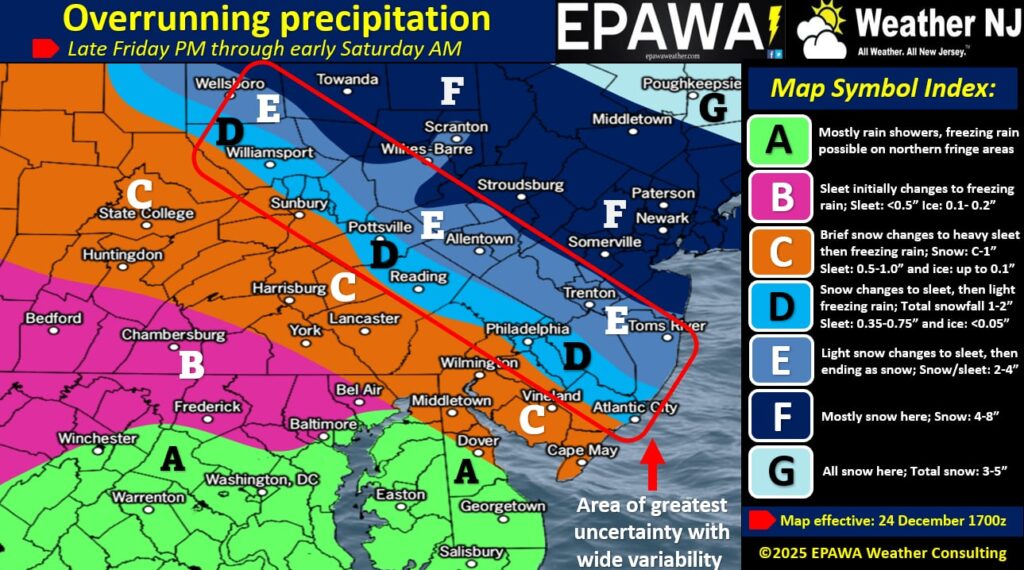 In English: Here is our first call for this Friday-Saturday (please see above wintry impact map). Today and tomorrow look great for travel…milder with little disruption during the days but still chilly nights. We then turn colder ahead of Friday evening and our system begins around 5pm Friday, ending by 5am Saturday morning. Expect the heaviest rates of precipitation, regardless of type between 7pm Friday night and 3am Saturday morning. This is the initial call. We have time to tweak a second call tomorrow (Christmas Day) and then a final third call Friday morning if need be.