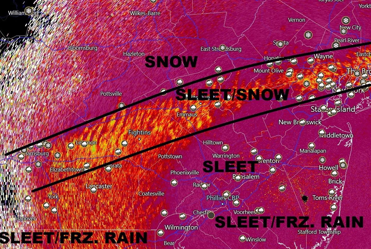 In English: This storm is going about as expected as it can given the Warm Air Advection (WAA) involved (the transition from snow to mixed) and so many other moving parts. From this point on, we have to recognize the safety hazards. The sleet, freezing rain and rain (S of I-78) are going to take normal snow hazards and up it X 10. Travel conditions are bad out there and you should stay in tonight/tomorrow if your situation allows. Ice just makes things so much worse. Many schools are closed alralread, and I imagine other closings and cancellations will happen for non-educational sectors. For areas that see rain in SENJ, that’s going to wash away salt ahead of the return to Arctic temps for said areas tomorrow. Those areas are going to need resalting. For areas N of the current snow/sleet line (between I-78 and I-80), continued snow accumulations above 12 will do the typical damage that a KABOOM does. Again, one thing we have working for us is reasonable winds, not horribly gusty like a blizzard. That will mitigate power outages some but not completely. I’ll put out another live observation reel later this evening/tonight when Phase II ends and Phase III begins. Please stay warm and be safe! JC