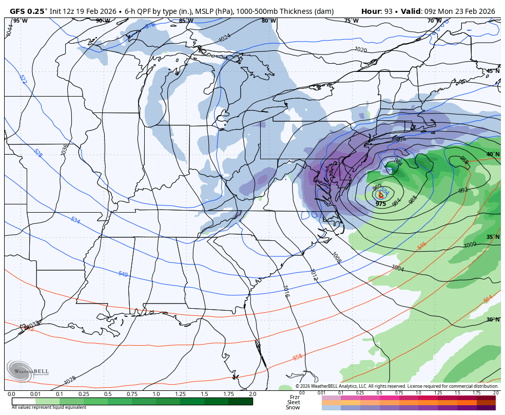 What we’re now looking closely at is the upper-level interaction between the sub-components of the Sunday-Monday storm energy, specifically what it does Friday-Saturday when moving from W US into the C US. We have a polar wave of energy that’s already over land in SW Canada. Then we have a Pacific wave of energy that should be onshore over N California tonight. For the major snowstorm to happen, the polar wave must phase into the Pacific wave in enough time to form a larger singular pocket of cyclonic vorticity to form a closed-off upper low. It must do this in enough time to throw a lasso around the coastal surface low that will be forming off OBX. The coastal surface low will be deepening in strength over time. If this low is lassoed back to the NW (towards NJ) before being allowed to eventually escape to the NW, then it deepens much closer to NJ and we get the historical KABOOM. This is what the GFS is suggesting (see below).