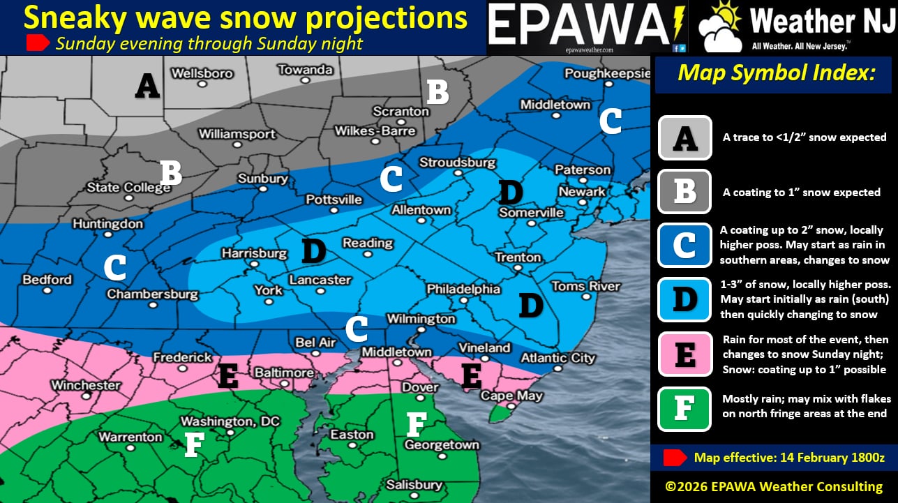 In English: We’re currently experiencing milder days but still colder nights (thanks to snow pack assist). Tomorrow (Sunday) temps will max well above freezing but then crash to freezing or just below after sunset. Precipitation will move into SNJ between tomorrow afternoon and evening, likely as rain first. Snow should then break out for NNJ/CNJ and slowly change from rain to snow for SNJ as a wet snowfall picks up in intensity from about 7pm into later Sunday night/just after midnight. All precipitation should taper off and end by 2-3am Monday morning. Extreme SNJ/SENJ should take the biggest snow accumulation reduction from surface temps and the most amount of rain. The jackpot is still yet TBD but should fall somewhere on our D zone of the above map. Expect that to tighten some for tomorrow’s map revision. Tomorrow we will also adjust amounts accordingly. Please note that we have the language “locally higher possible” in our jackpot ranges to account for some of the more aggressive recent trending model guidance. However, even in the coldest performance possible, I doubt this would produce more than a 2-4/3-6 situation. The marginal temperature environment and progressive quick-moving timing limits that upside maximum potential. On the other hand we are as low as one inch on the bottom of our jackpot ranges. The good news is that right after this, we head into our warmup next week which will melt most of this as well as any remaining snow pack from the Jan 25 system. I’ll try to get a video out tonight to better visualize some of the dynamics involved. But it might be later as I’m cooking a very special meal for my two favorite Valentines (Mrs. JC and Sophie). Have a great rest of your Saturday and please be safe! JC