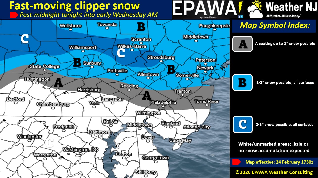 In English: A clipper could bring a coating to an inch of snow through NNJ/CNJ (less so for SNJ), maybe a 1-3 situation for NNJ/NWNJ tomorrow (Wednesday) morning. Not a big deal but could reduce visibility during times of snowfall and slightly slicken up untreated surfaces. We then warm for a quick melt Wednesday afternoon but fall again Wednesday night into Thursday. Thursday still gets above freezing for many but then as the sun sets and temps feather down, more snow is possible Thursday night mainly for SNJ (either a light hit or barely a graze). Another quick mover so maximum upside potential is a 2-4 event but likely less will actually fall and stick. Watching March 2-4 for another snow system then March 5-7 for a warmer system to take us into a period of prolonged mild temperatures. Winter is cracking at the seems but we do have to give it through the end of March for the baseball game to end (see above baseball timeline image). Be safe! JC