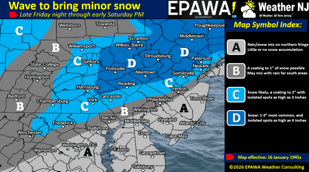 Neither system is a major snow event but either one could become a plowable light-to-significant snowfall. 6 inches is probably the absolute max upside potential for either or but here’s the catch, the Saturday system affects the Sunday system. If Saturday’s Arctic front/shortwave is stronger and more aggressive (higher snowfall totals), then the boundary will come to rest further out in the Atlantic Ocean. This would mean the Sunday coastal low tracks further out to sea and just grazes SENJ, possibly missing completely. However, if the Saturday morning system is weaker and produces, say only a coating to a few inches, then that means the boundary will come to rest closer to the east coast and the coastal low on Sunday will track closer, increasing SENJ snowfall totals all the way into I-95/NJTP. So with this IF THEN/OR ELSE scenario, we have made two snow maps. The first map contains expected snowfall amounts for Saturday morning. The second map is for Sunday and is probabilistic based. Tomorrow, we’ll be able to make a much more confident map for Sunday once we see the extent of Saturday’s NNJ snowfall outcome. With that said, this is where we are: