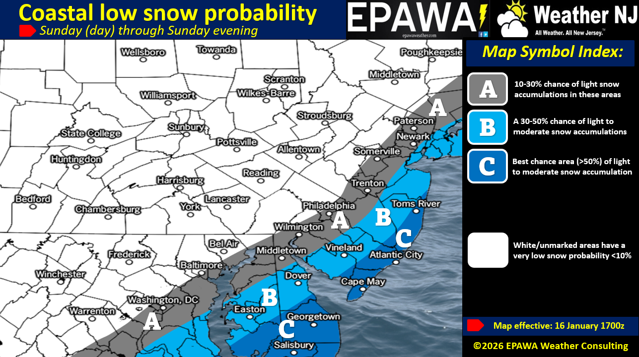 Neither system is a major snow event but either one could become a plowable light-to-significant snowfall. 6 inches is probably the absolute max upside potential for either or but here’s the catch, the Saturday system affects the Sunday system. If Saturday’s Arctic front/shortwave is stronger and more aggressive (higher snowfall totals), then the boundary will come to rest further out in the Atlantic Ocean. This would mean the Sunday coastal low tracks further out to sea and just grazes SENJ, possibly missing completely. However, if the Saturday morning system is weaker and produces, say only a coating to a few inches, then that means the boundary will come to rest closer to the east coast and the coastal low on Sunday will track closer, increasing SENJ snowfall totals all the way into I-95/NJTP. So with this IF THEN/OR ELSE scenario, we have made two snow maps. The first map contains expected snowfall amounts for Saturday morning. The second map is for Sunday and is probabilistic based. Tomorrow, we’ll be able to make a much more confident map for Sunday once we see the extent of Saturday’s NNJ snowfall outcome. With that said, this is where we are: