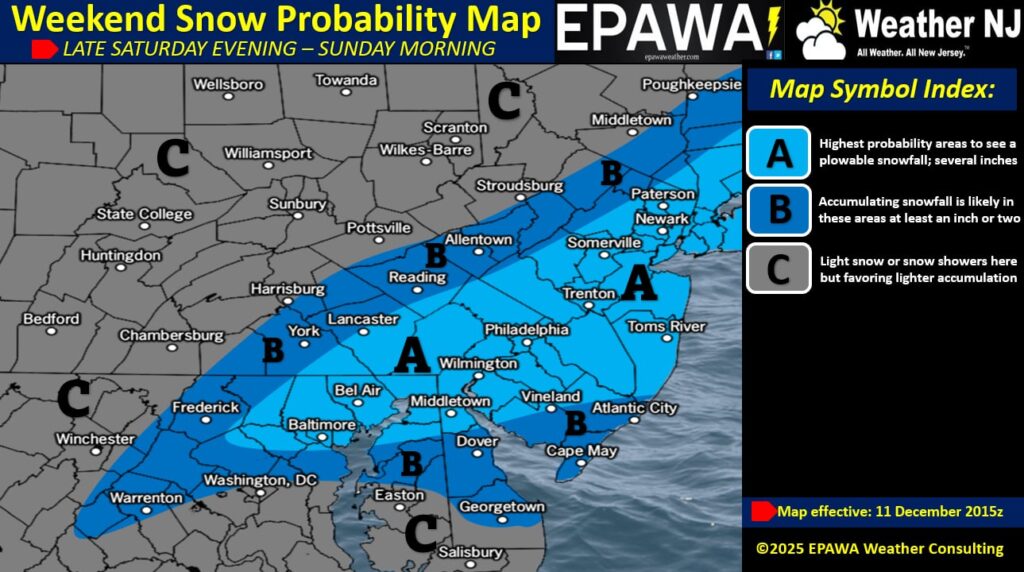 I’m really pulling for a statewide 2-4, iso 4+ situation for the entire state (not our official amount expectations just yet). This would be the ideal snow lover’s fruition and would allow for that hot chocolate holiday lights cruise Sunday evening. However, deviations in the fickle zonal nature of the wave could mean slight variation N to S. A little N and SNJ/SENJ gets robbed from air not able to cool enough at the surface via marine influence. A little S and only CNJ/SNJ gets the snow while NNJ, possibly some of CNJ gets skunked. We still need to iron out this part of it which is why today’s impact map (see below) is only in the form of a probabilities map. But for now, I’m leaning towards a plowable snowfall for much of NJ with the potential for something a little more between midnight Saturday night and 10am Sunday morning.