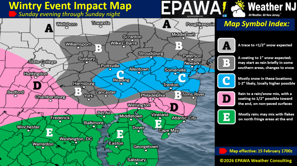 In English: The northern side of a weak storm is going to graze NJ with some wet heavy snow and rain this evening into early tomorrow morning. NNJ/CNJ will likely see the most wet snow and SNJ likely the most rain. Our wintry impact map above illustrates the middle-of-the-road approach to expected snow accumulations and rainfall. However, we are leaving the door open on either side as wildcards meaning it could be more of a slushier widespread C-1 kind of thing or possibly a 2-4/3-6 event in the case of higher performance. For this reason we use language like “locally higher possible” in our legends. Our map represents what we feel is the most reasonable and realistic public communication. Precipitation starts around 5-7pm for SNJ (NNJ by 8/9pm) this evening and then falls until about 1-3am Monday morning. Live observations will begin on first flakes this evening. Be safe! JC